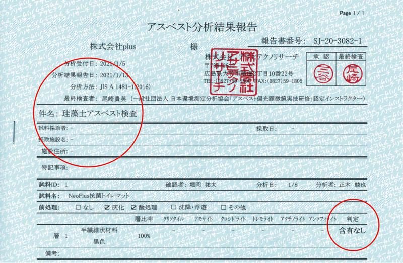 プラスは、珪藻土を素材とする『NeoPlus抗菌トイレマット』を国の指定機関「株式会社アサヒテクノリサーチ」に依頼して検査を実施。その結果アスベストの含有率は0%。人体に有害な物質が含まれていないことがあらためて証明され、多くの来店客が利用するトイレに安心して導入できることが確認された。