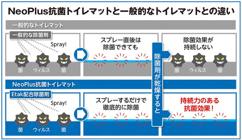 従来の『NeoPlus抗菌トイレマット』は、尿石を多く含む人の汚垂(おだれ)が何度もマットに付着すると、表面が白くなることがあった。放置するとカーペット専用シミ消し剤などを使っても、取りきるまでに時間がかかっていた。