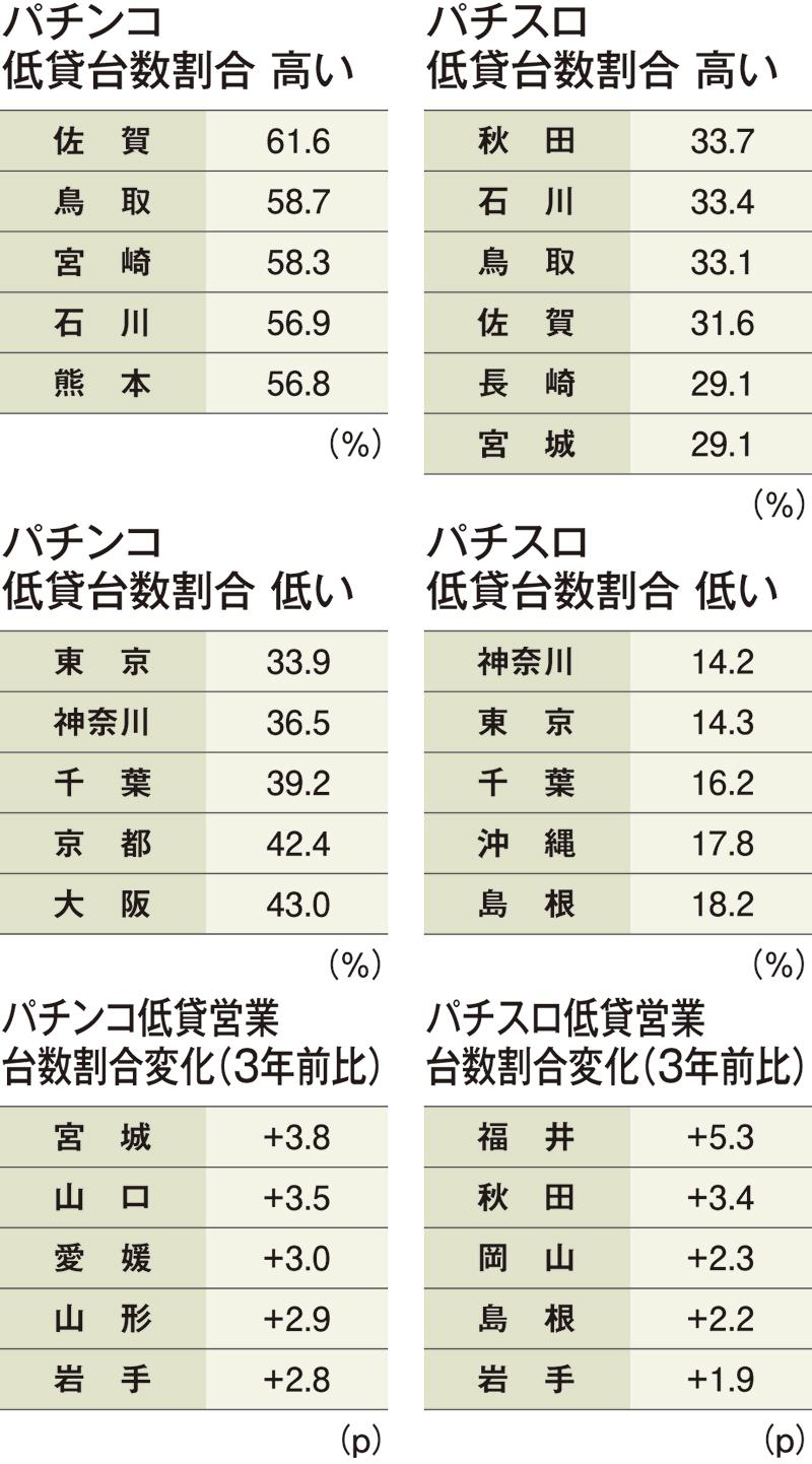 パチスロの低貸台数割合が最も高いのは秋田(33.7%)で、これに石川、鳥取、佐賀、長崎、宮城が続く。逆に低貸台数割合が低いのは神奈川(14.2%)、東京、千葉など。