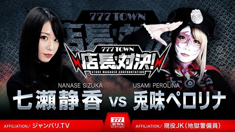 ユーザーが店長になってホールを経営したり、他のユーザーが設営したホールで遊べるスマートフォン向けサービス「777TOWN mobile」の「みんなのホール」では、店長に就任したペロリナさんと七瀬さんの各店舗でプレイしたユーザー全員の出玉で対決する。
