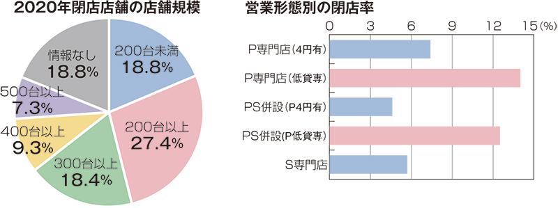店舗規模別に見た昨年1年間の閉店数は「299台未満」が46.2%を占めた。2019年12月末時点の1店舗の平均台数(警察庁発表)は435台なので、小型店ほど閉店した割合が多かったことになる。一方、「500台以上」の規模の閉店は少なく、閉店した店舗の1割未満だった。