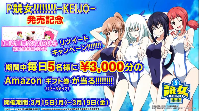 また、3月15日から19日までの期間に「P競女!!!!!!!!-KEIJO-発売記念」として、Twitterでキャンペーンを実施。期間中に同社のTwitterアカウント【豊丸産業公式】のばらをフォローし、キャンペーンのツイートをリツイートするだけ。毎日5人にAmazonギフト券3000円分が当たる。