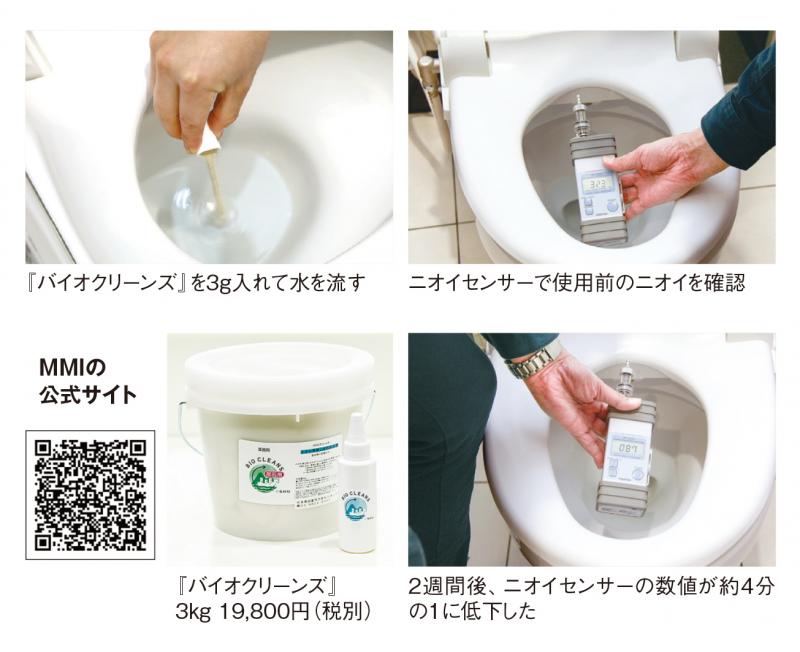 MMIの消臭剤『バイオクリーンズ』は、微生物が排水管などの有機物を分解する成分を含んでいるので、排水管の尿石をはじめ悪臭やつまりをパワフルに解消する。排水の難分解性有機物の分解力に優れたスーパーバイオ(微生物)だけを厳選して製品化。菌が1gあたり、100万個以上含まれていて、効果が持続しやすいのが特徴だ。