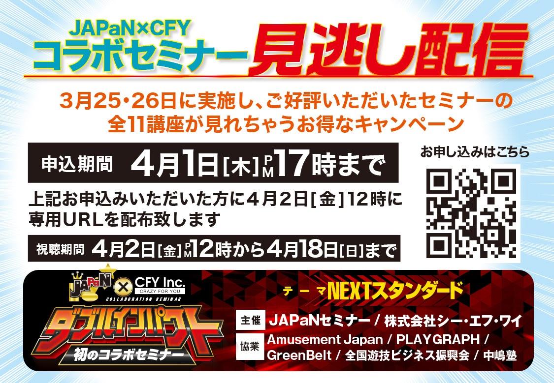 3月25日・26日にオンライン形式で開催された、JAPaNとCFYのコラボレーションセミナーが、期間限定で見逃し配信(アーカイブ配信)をすることが決定した。