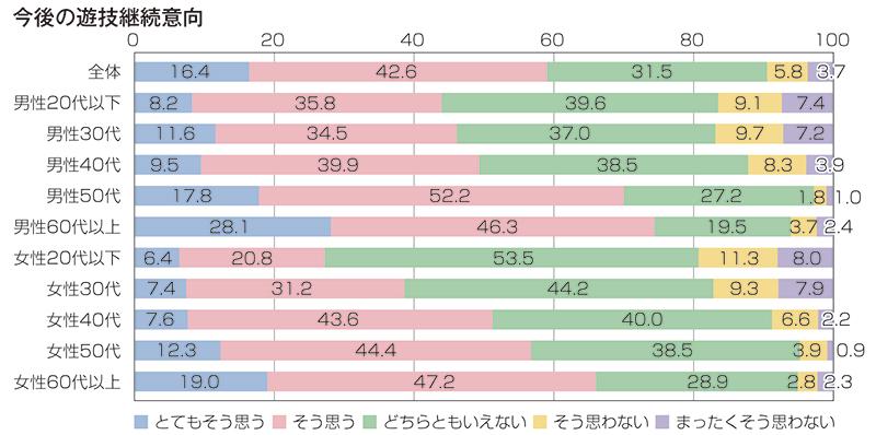 今後も遊技を続けるかを尋ねた問いでは、回答者の59.0%が継続意向を示した。離反意向を示した人の割合は9.5%。遊技を継続しようと考えている人の割合は、男女ともに高齢になるほど高まる傾向があり、60代以上の男性では74.4%に達した。
