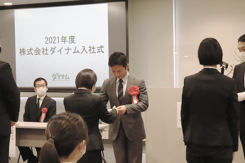 入社式では保坂明社長が式辞で「コロナ禍での就職活動においてはさまざまな葛藤や悩み、 苦労があったことと思います。 そのような中で最終的にダイナムを選び、ともにこの日を迎えられたことを本当に喜ばしく思います」と新入社員を思いやった。
