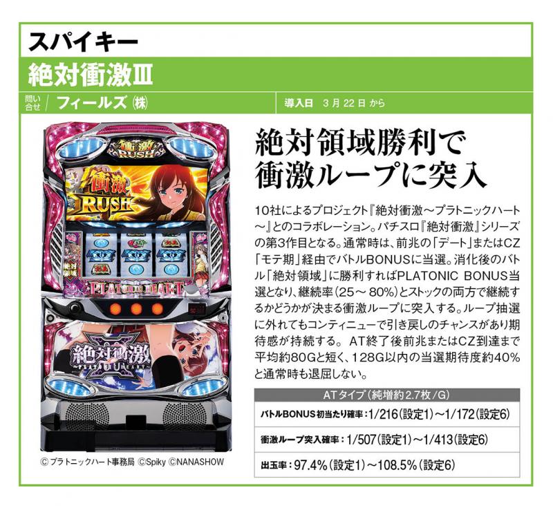 『絶対衝激Ⅲ』は、前々作・前作からのファンが多く、しかも稼働牽引役の若者に人気が高いシリーズ機として期待できる。GWから夏にかけて、話題機が少ないパチスロ市場でどんな役割を果たしていくか注目したい。