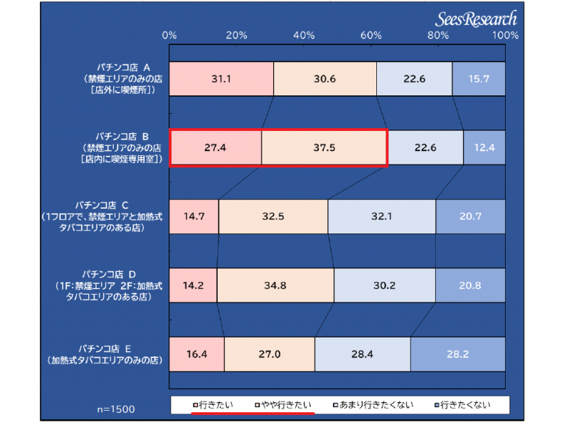 ホールの喫煙・禁煙環境の形態を5種類提示し、それぞれについて来店意向を「行きたい~行きたくない」の5段階スケールで尋ねたところ、喫煙者・非喫煙者ともに最も来店意向度が高かったのは、「店内に喫煙専用室がありフロアが禁煙」という形態だった。