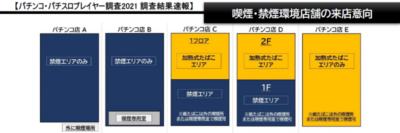 昨年4月からの屋内完全分煙などの喫煙環境の変化があったが、店舗選択において喫煙(禁煙)環境を気にしているのは非喫煙遊技者で、半数が「喫煙(禁煙)環境を優先して遊ぶ」と回答した。喫煙遊技者では、「喫煙(禁煙)環境を優先して遊ぶ」と回答したのは3割。