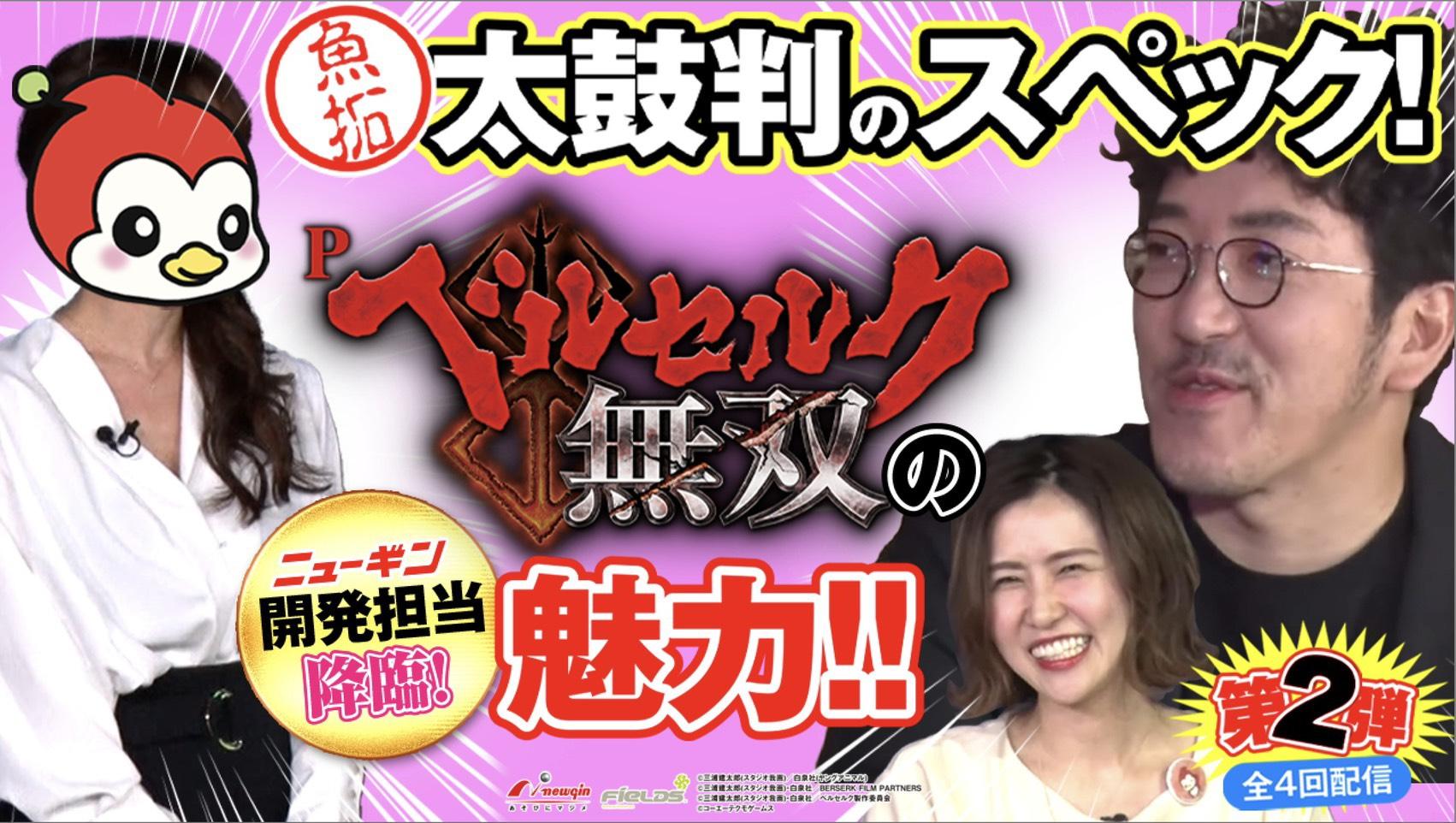 出演はパチンコライターの木村魚拓さん、青山りょうさんのほか、アニメ「ベルセルク無双」でキャスカ役を演じた声優の行成とあさんと人気ゲーム実況者のこーすけさん。第2弾では『Pベルセルク無双』の開発担当者が登場して新台の魅力を徹底解剖する。
