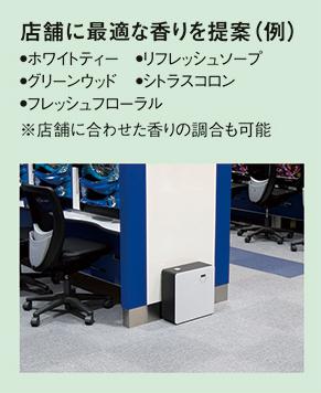 植物由来の抗ウイルス剤を配合して、香りをコントロールしながら空間を除菌・消臭する。ナノスケールの霧化噴霧で遠くまで香りを拡散。店舗のイメージに合わせて最適な香りをプロデュース。フレグランスオイルの交換ボトルを定期的に届ける安心のレンタルプランで提供する。