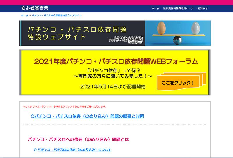 パチンコ・パチスロ産業21世紀会は5月14日、Webサイト「安心娯楽宣言」内で、「2021年度パチンコ・パチスロ依存問題WEBフォーラム」の配信ページを公開した。