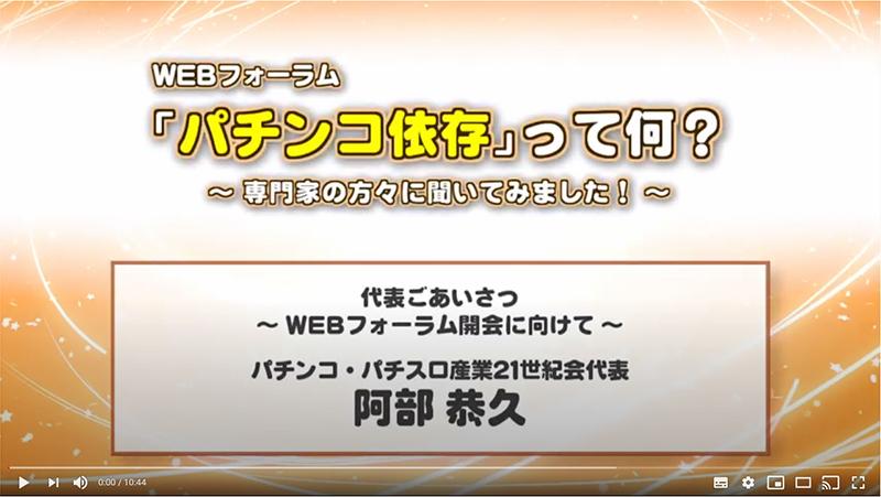 フォーラムのタイトルは「『パチンコ依存』って何? ~専門家の方々に聞いてみました!~」。21世紀会の阿部恭久理事長による代表あいさつのほか、5人の専門家による動画がYouTubeに公開された。公開期間は1年程度を予定しているという。