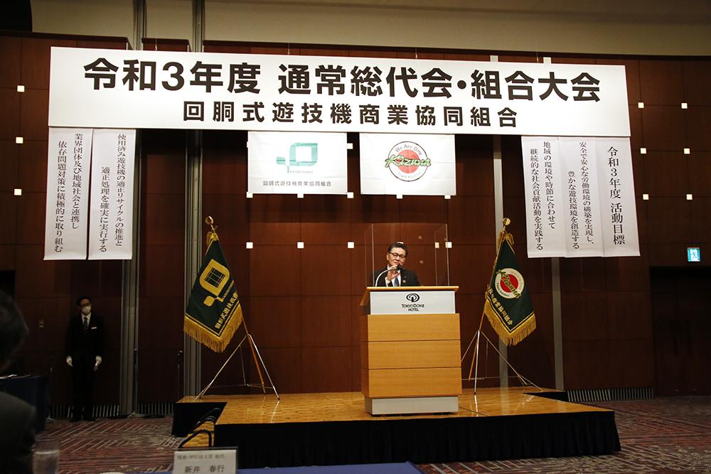 回胴式遊技機商業協同組合は5月25日、東京ドームホテルで通常総代会と組合大会を開催した。新型コロナウイルス感染防止対策として会場には理事ら関係者のみが集まり、組合大会はオンラインで配信された。