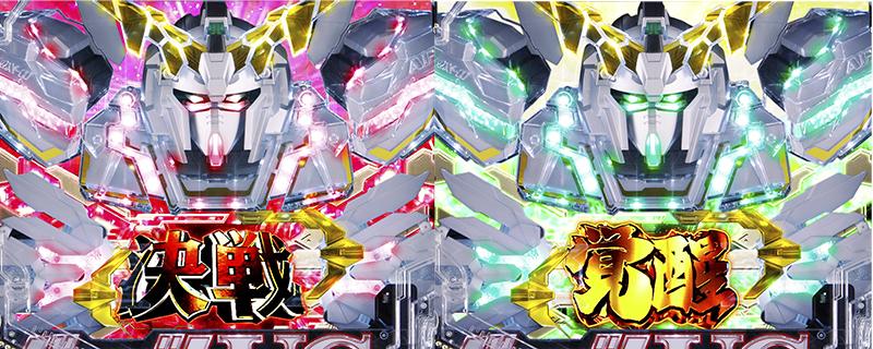 ユニコーンガンダムは基本状態の一角獣(ユニコーンモード)から、破壊の獣(デストロイモード)または覚醒の獣(ユニコーンガンダム覚醒)へと変身する。本機でも変身が注目ポイントで、リーチ中に「破壊の赤」になるか「覚醒の緑」になるかで期待度が変化する。