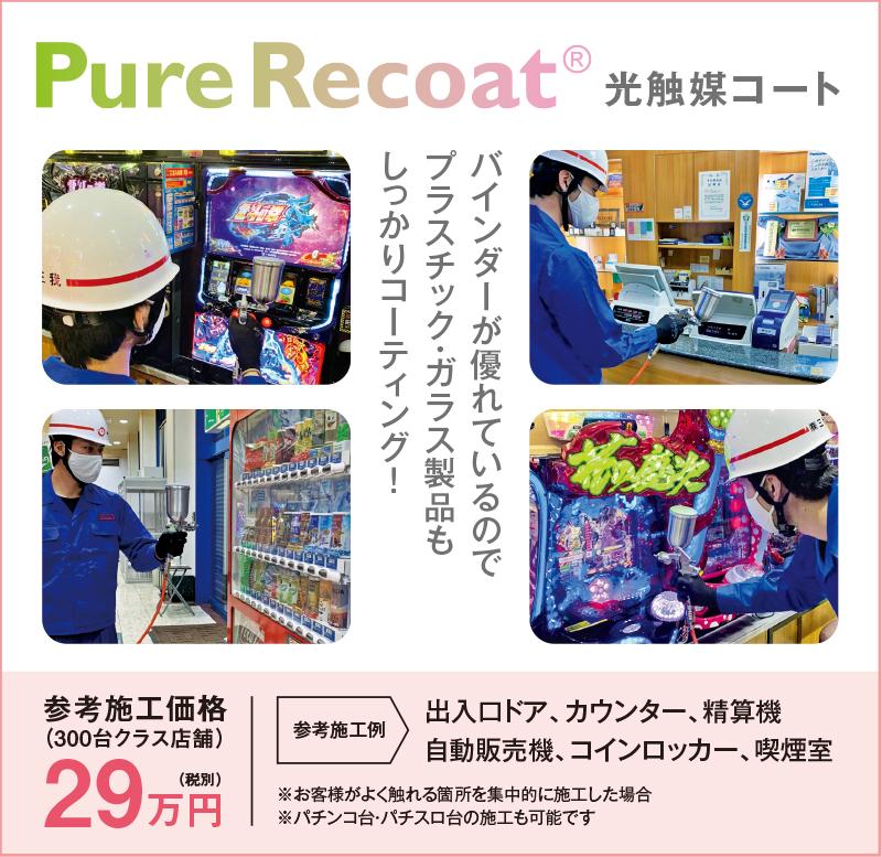 新型コロナウイルスの感染拡大を受けて同社では、抗菌・抗ウイルス・防汚のトータルソリューション『Pure Recoat』を開発した。ニューギン・アドバンスではこの技術に着目し、パチンコホール向けの販売を担うことになった。