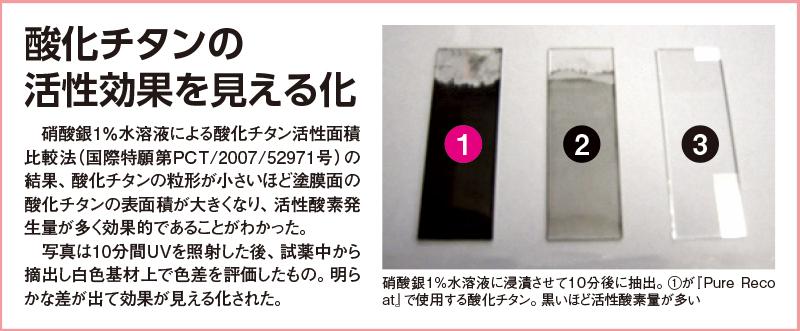 まず、独自開発の測定方法によって活性酸素発生量をその場で測定することが可能になった。次に、高レベルの酸化チタン分散技術を開発し、酸化チタンの含有量を増やすことに成功。最後に高い成膜技術によって塗膜乾燥時に下方向の力が働き、クラックが発生しづらい施工を実現した。こうしたイノベーションによって、酸化チタンの活性効果の測定で活性酸素発生量が多く、効果的であることを証明することに成功した。