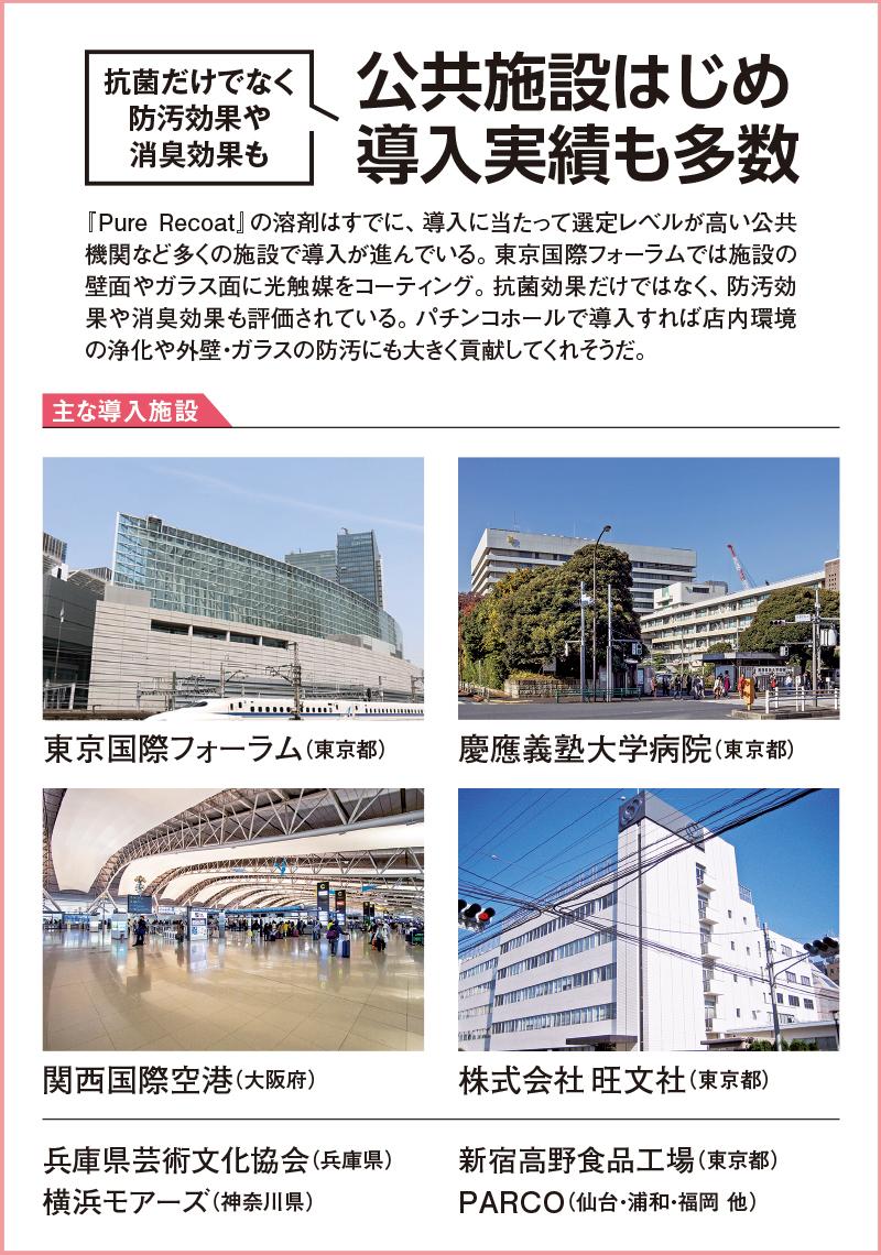 同社の光触媒にはバインダー(接着剤)がしっかりと含まれている点も大きな特徴だ。バインダーが含まれていない光触媒では、プラスチック製品等の表面がつるつるとした素材にはコーティングが付着しづらく、ホールスタッフが行うアルコール消毒によって、光触媒が消えてしまうこともあるが、『Pure Recoat 光触媒コート』ではその心配もない。光触媒とアルコール消毒が併存できるため、遊技客に対してワンステージ高い安心と安全を提供できる。