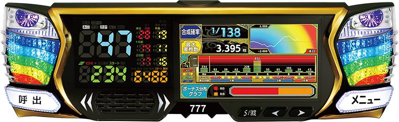 視認性を高めるため、表示部にはシリーズ最大級の大型7セグと7インチワイド液晶を搭載。7セグは回転数や大当たり回数などのデータを表示し、液晶表示部ではスランプグラフや大当たり履歴などを詳細に表示する。