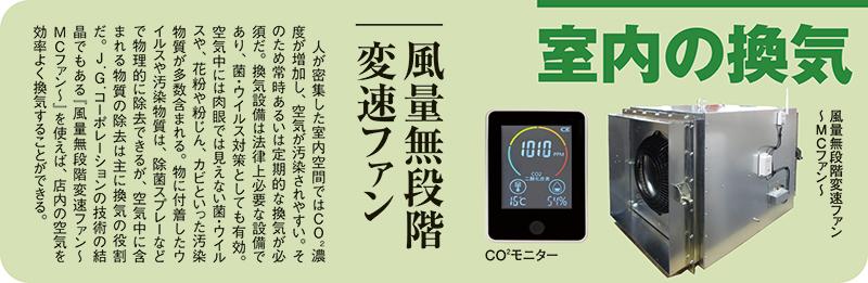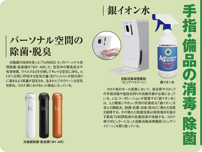 専門家は、もともとたばこの煙を前提にしたパチンコホールは換気性能が優れているので「密閉に当たらない」と指摘しているが、本当に適切な換気がなされてるかは、個々の店舗で確認する必要があるだろう。そんなときに頼りになるのが、「室内の空気環境を考える会社」を標榜するJ.G.コーポレーションだ。同社では、コロナ禍においても「withコロナ時代の空気環境ソリューション」として、①菌・ウイルス対策、②室内の換気、③手指と備品の消毒・除菌という3つのテーマでホールに安心・安全を提供している。それぞれのテーマ別に見てみよう。