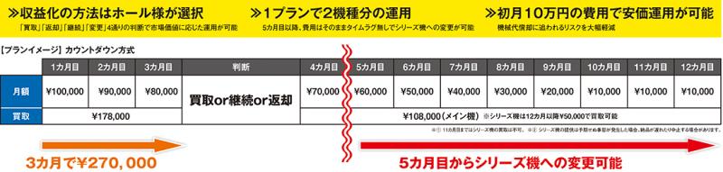 遊技機の評価が思わしくなかった場合のリスク回避策も別に用意されている。Dバリュープラン対象機種は、5カ月目以降にシリーズ機への変更が可能な点だ。使用料金はメイン機導入から数えて5カ月目が6万円で、以降、毎月1万円ずつ減少し、10カ月目以降は1万円で使用できる。12カ月目以降は一律5万円でシリーズ機の買取が可能だ。