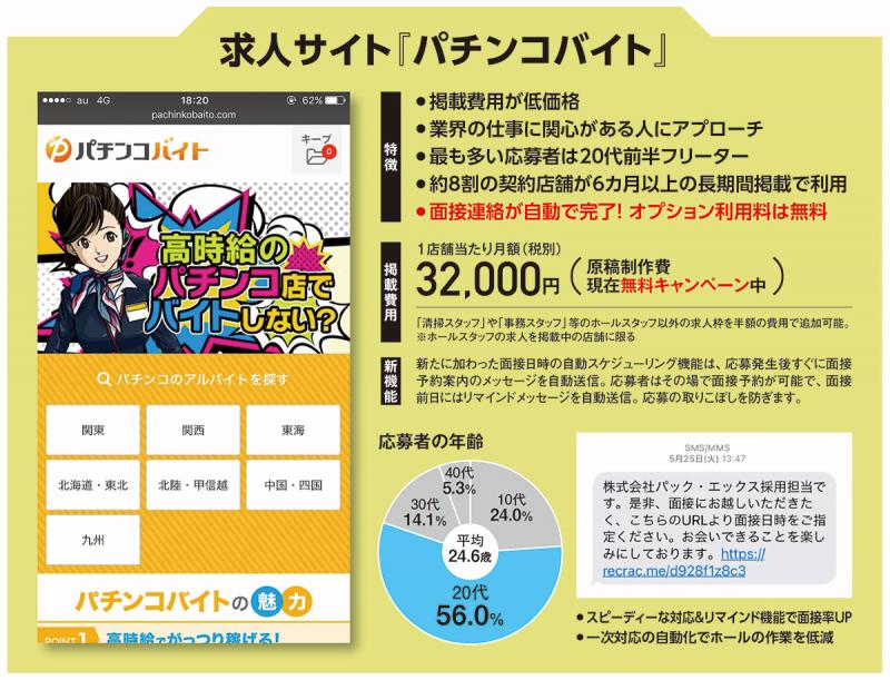 『パチンコバイト』は、パチンコホールの仕事に特化した求人サイトのため、パチンコやホールの仕事に関心がある人からの問合せや応募が主になっている。掲載費用が大手求人媒体の4割~8割という低価格というだけでなく、トータルで見たときの費用対効果の高さも評価されているようだ。