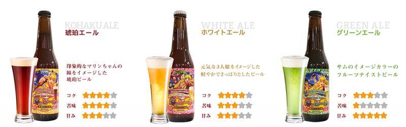 ビールは、ポップやモルトの香ばしさとほのかな甘みが特徴の琥珀エール、きめ細やかな白い泡と軽やかなさっぱりとした口あたりのホワイトエール、ほのかな甘みを持つフルーツテイスト(ライチ果汁使用)ビールのグリーンエールを用意した。