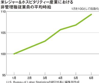 6月の統計によると、米国のレジャー&ホスピタリティー産業における管理職を除く従業員の平均時給は、5月には前月より0・17ドル上昇、6月には同0・37ドル(2・3%)上昇して16・21ドルになった。これは前年同月比では11・2%の上昇だ。