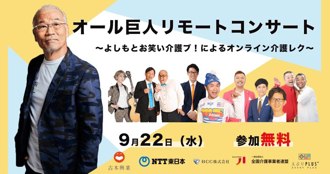 吉本興業ホールディングスなど連携5社は、9月22日から介護施設などを対象に『よしもとお笑い介護レク〜オンライン〜』の提供を開始。サービス提供開始にあたり、キックオフイベントとして、同日14時〜15時に、「よしもとお笑い介護ブ!によるプチ・介護レク」「オール巨人リモートコンサート」を配信、Zoomで視聴することができる(無料)。
