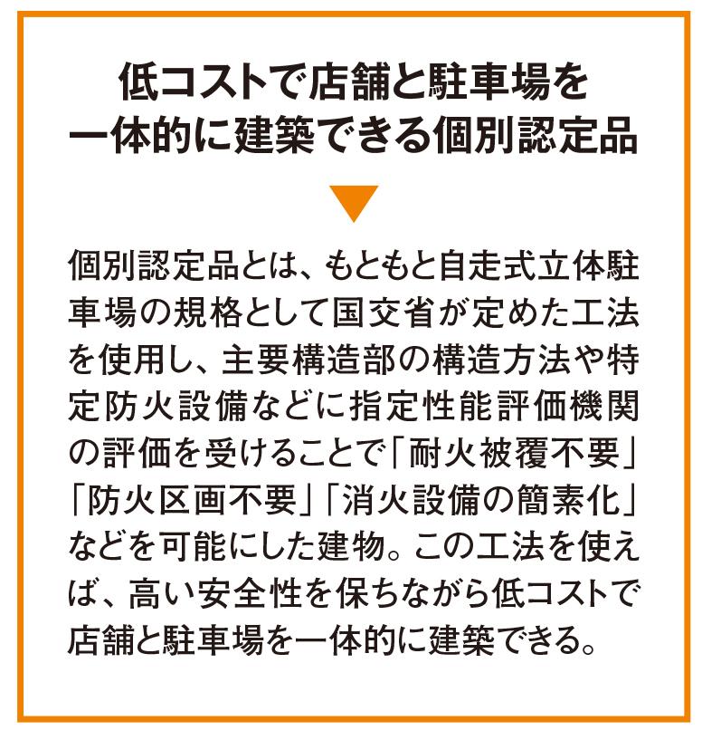 自走式立体駐車場大手の雄健工業が手掛ける店舗付駐車場。これまで数多くのパチンコホールで導入されてきたこの建築工法がいま、さまざまな商業施設に広がっている。その理由は低コストと収益性にある。