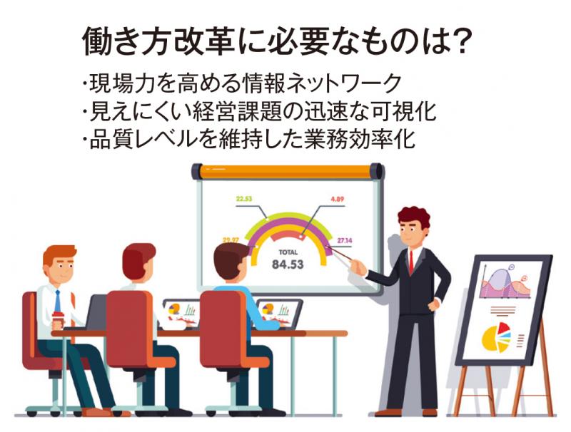手作業で集めた複数のデータを集計し、分析や報告書作成に多くの時間を割いている企業も多いと思います。『Compass』を使えば、こうした業務を自動化して業務コストを削減できます。例えば、以前の業務時間を100とすれば、導入後は50に削減できます。特に、会議・報告(日報報告や会議資料・月次予算などの作成)にかけていた時間は、約4分の1に圧縮することも可能です。パソコンさえあればどこでも情報を共有できますので、テレワークの推進にも大きく役立ちます。