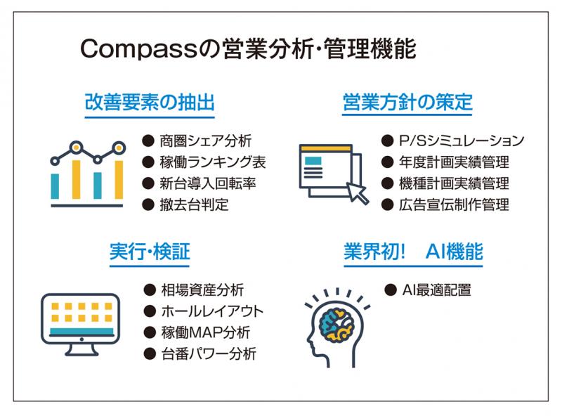一方、刻々と変化する現場で、最適な施策を実行するために、リアルタイムなデータ分析が必要です。『Compass』は、短時間で効率的な管理を行うためのツールや分析テンプレートが揃っています。例えば、営業分析と商圏分析をミックスした「撤去台選定」、予実管理などのデータ追究に便利な「ドリルダウン機能」、個別台分析に欠かせない「ホールレイアウトによる営業分析」なども情報共有を図りながら効率良く行えます。さらに、バラエティ台の最適配置のためにAI技術を使った機能やPSシミュレーション機能など、経験やカンだけに頼らない営業をサポートする機能が充実しています。
