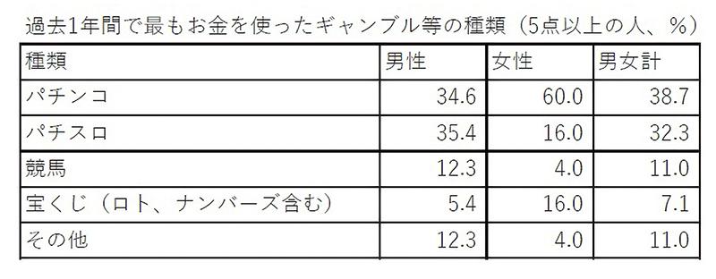 一方、SOGSで5点以上を得点した人では、1カ月あたりに使用した金額の中央値が5万円だった。過去1年間で最もお金を使ったギャンブル等の種類は、パチンコ(38.7%)、パチスロ(32.3%)、競馬(11.0%)、その他(11.0%)の順。男性ではパチンコとパチスロを挙げた人の割合が35%前後で同等だったが、女性ではパチンコが60.0%、パチスロが16.0%と差があった。