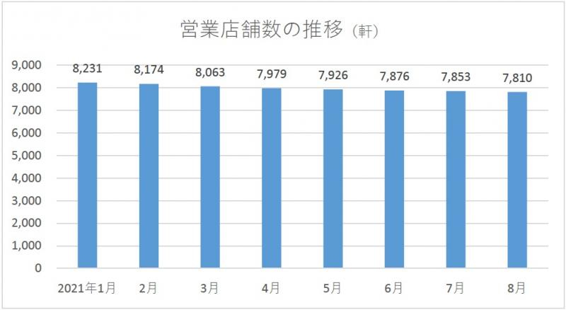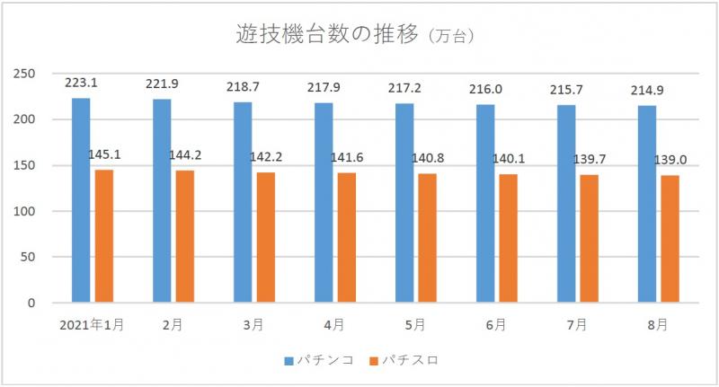 2021年09月17日No.10002470 全日遊連 加盟店舗数8月末の営業店舗数は7810軒 全日本遊技事業協同組合連合会が集計した組合加盟店舗の実態調査によると、2021年8月末時点の営業店舗数は7810軒で、前月より43軒減少した。新規店舗数は0軒、廃業店舗数は43軒、当月中の休業店舗数は25軒。 8月末時点のパチンコ遊技機台数は214万9246台で、前月より7488台減少した。パチスロ遊技機台数は138万9616台で、同7060台減少。その他を含む遊技機総台数は353万8899台だった。
