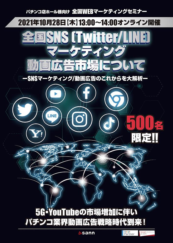 SANNは10月28日・13時〜14時、ホール向けWEBセミナーを開催する。テーマは、「全国SNSマーケティング 動画広告市場について」。TwitterやLINEによるマーケティングやYouTube市場拡大に伴うホール業界での動画広告戦略を紹介する。