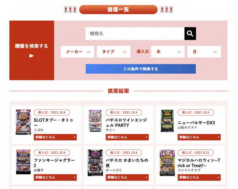パチスロメーカーから発売される機種一覧も見やすく表示。業界の最新ニュースやパチスロサミットからのお知らせなど情報コーナーも充実させた。