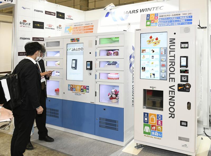 冷蔵マルチロール自販機『MV-20』は、温度設定により冷蔵品以外も販売可能な自販機で、24時間無人営業を実現する。前面にサイネージを搭載して商品の内容や広告を掲載できるので、利用者は商品内容を理解して購入できる。