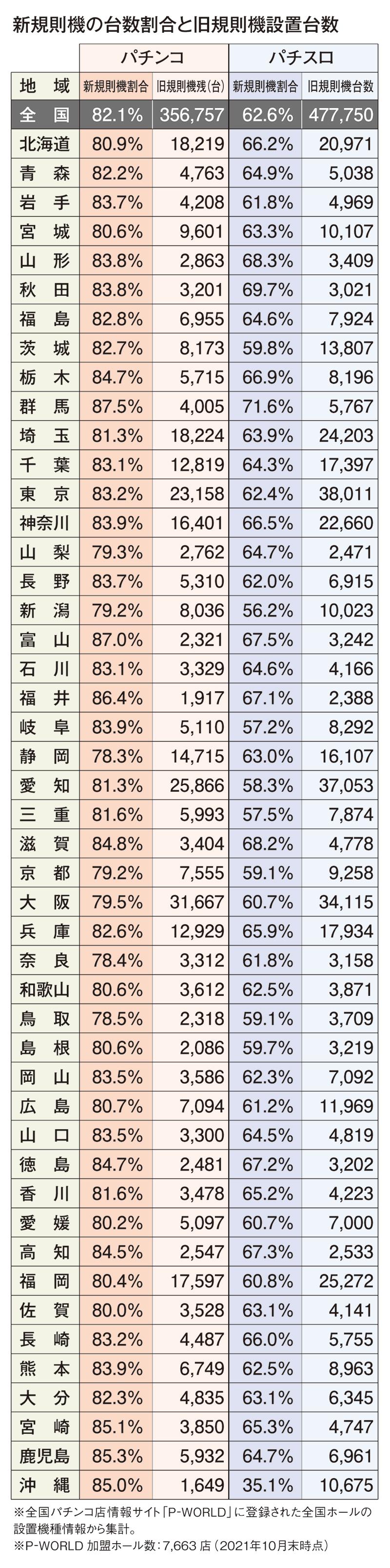 アミューズメントジャパンがピーワールド・インサイトの協力を得て、P-WORLDに登録されているホール7663店舗の遊技機設置状況を調べたところ、10月末時点の旧規則機台数は約83万台だった。非登録ホールを含めれば、その数はさらに数%増し。残り3カ月を切った撤去期限までにすべてを適正処理することは難しく、2022年2月以降も“旧規則機問題”は続きそうだ。