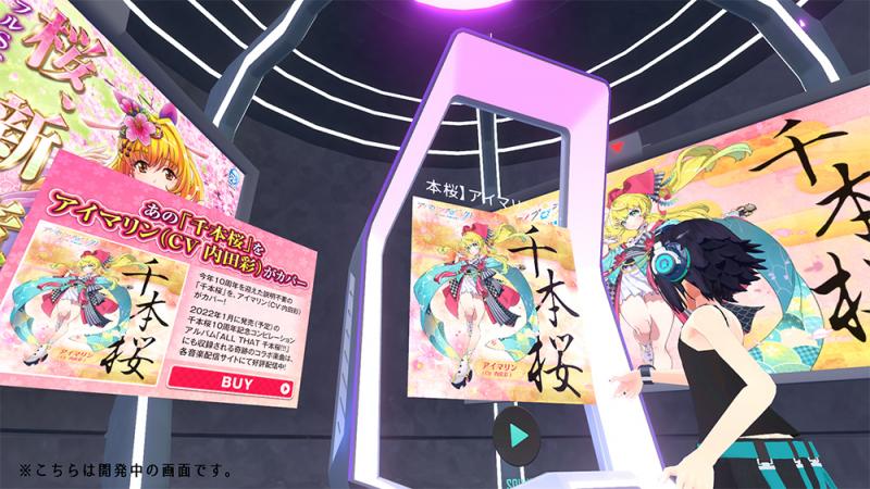 三洋のブースではアイマリンの3Dモデルのアバターが出迎え、『Pスーパー海物語 IN 沖縄5 桜Ver.』の大当たりラウンドに採用している「千本桜」(歌唱:アイマリン/CV:内田彩さん)の映像を大型モニターで放映する。視聴は無料、楽曲はその場で購入できる。