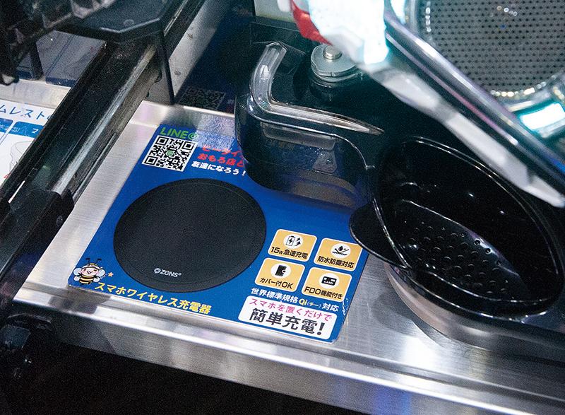 『ピータイムおもろ』(沖縄県那覇市)は、商業集積エリアにありながら住宅地にも近いという好立地にあり、稼働率の高さで全国区の知名度を誇る。同店は10月上旬に、3日に分けて新たな設備の導入工事をおこなった。導入したのはスマートフォン用のワイヤレス充電器で、パチンコ全240台の膳板部分のほか、中央通路の休憩コーナーに8カ所、併設軽食店のカウンター席7カ所に設置した。