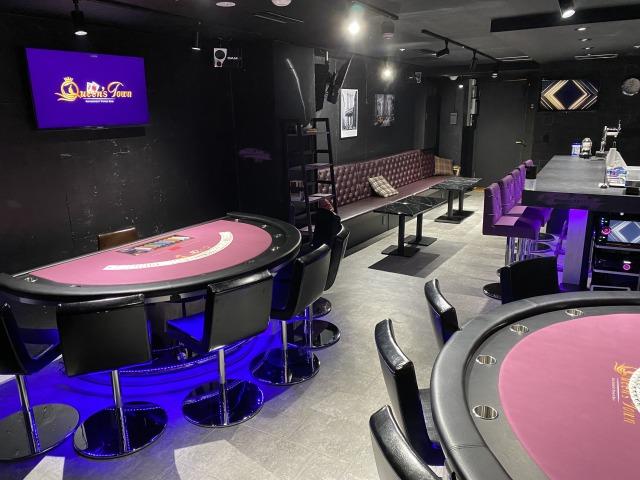 辰巳 帰国した時点ではまったく考えていなかったことなのですが、東京ではポーカー人気の高まりを背景に、アミューズメントのポーカールーム(風適5号営業)やポーカーバー(5号営業+特定遊興飲食店営業+深夜酒類提供飲食店営業)の需要があります。その開業をお手伝いした第1号が11月1日に開業したポーカーバー『Queen's Town Roppongi』です。ポーカーテーブル2台のほか、バーカウンターとボックス席があります。このボックス席部分には、必要に応じてポーカーテーブルを1台増設できます。アルコールは1000円、ソフトドリンクは500円という一律料金です。