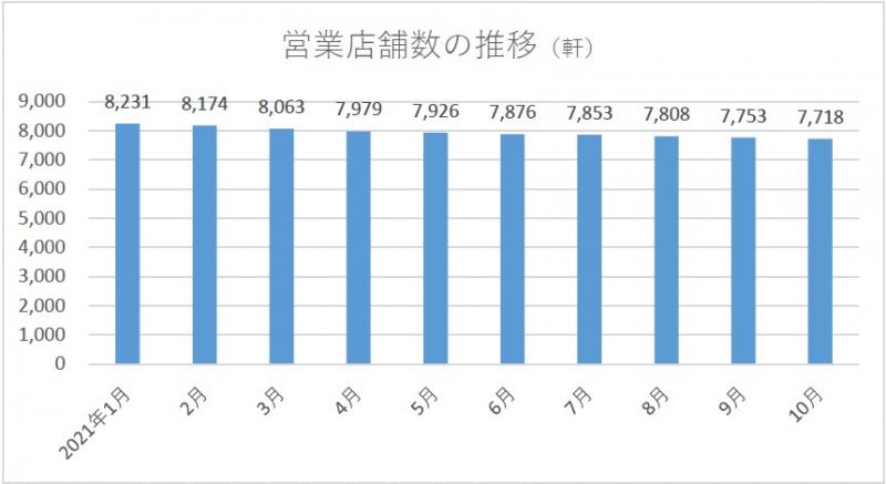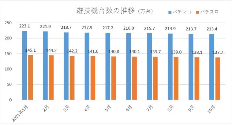 2021年11月17日No.10002539 全日遊連 加盟店舗数10月末の営業店舗数は7718軒 全日本遊技事業協同組合連合会が集計した組合加盟店舗の実態調査によると、2021年10月末時点の営業店舗数は7718軒で、前月より35軒減少した。新規店舗数は2軒、廃業店舗数は39軒、当月中の休業店舗数は25軒。 10月末時点のパチンコ遊技機台数は213万3652台で、前月より3266台減少した。パチスロ遊技機台数は137万6621台で、同4699台減少。その他を含む遊技機総台数は351万310台だった。
