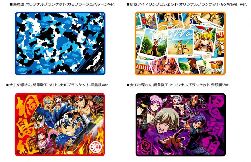 冬の新商品第1弾として、オリジナルブランケットが登場。裏面がフリース生地のため、温かく、軽量でコンパクトだ。ブランケットは『海物語 オリジナルブランケット カモフラージュパターンVer.』、『新章アイマリンプロジェクト オリジナルブランケット GoWave! Ver.』、『大工の源さん 超韋駄天 オリジナルブランケット 桐島組Ver.』、『大工の源さん 超韋駄天 オリジナルブランケット 鬼頭組Ver.』の全4種をラインナップしている。