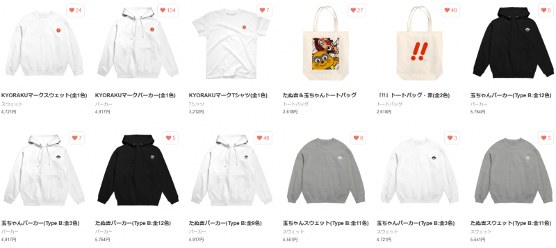 商品ラインナップは、Tシャツ、パーカー、スウェット、ステッカートートバッグ、グラス、ノートなど、全30種類。同社のマスコットキャラクター「たぬ吉」「玉ちゃん」の絵が入ったデザインから、ビックリマークのKYORAKUロゴなどをモチーフにしたデザインのアイテムをリリースした。