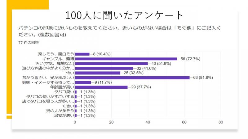 B班は実店舗調査で感じた初心者に対するスタッフの対応の不十分さや、アンケート調査から見えた業界の現状を踏まえて、パチンコ体験イベントの拡充を提案。その背景には、「パチンコに行かない理由」を20代を中心にアンケート調査した結果、「そもそも興味がない」が73.3%、「やり方が分からない」が22.4%と、若年層への接触機会の少なさが浮き彫りになったことを挙げた。