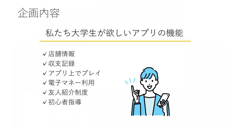 A班は友人紹介制度のあるアプリの開発を提案。パチンコ・パチスロユーザーの約8割が、遊技のきっかけが家族や親戚、友人などからの誘いという点に着目して、友人紹介制度で成功したUber EatsやTik Tokなどのアプリを事例にその効果を説明した。