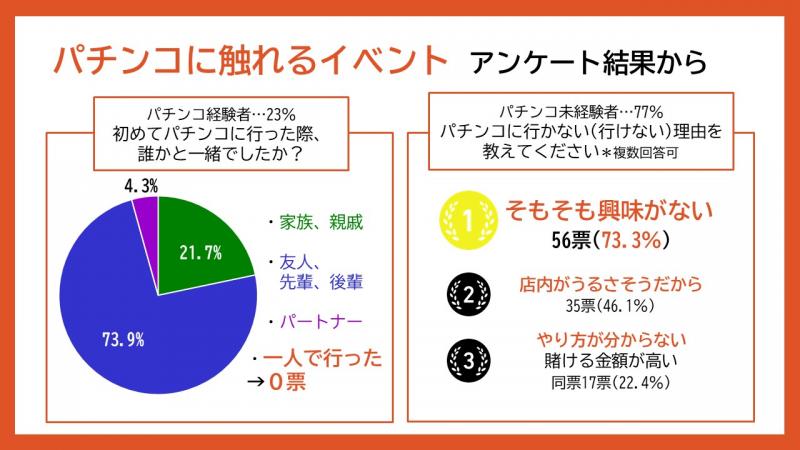 加えて、20代パチンコ経験者への調査で、入り口がすべて家族や友人からの誘いで、一人でパチンコホールに来店してパチンコを始めた人が一人もいないということが判明。そこで、接触機会増加のため、特設会場の設置や既存店舗内での専用エリアの常設などの重要性を説いた。