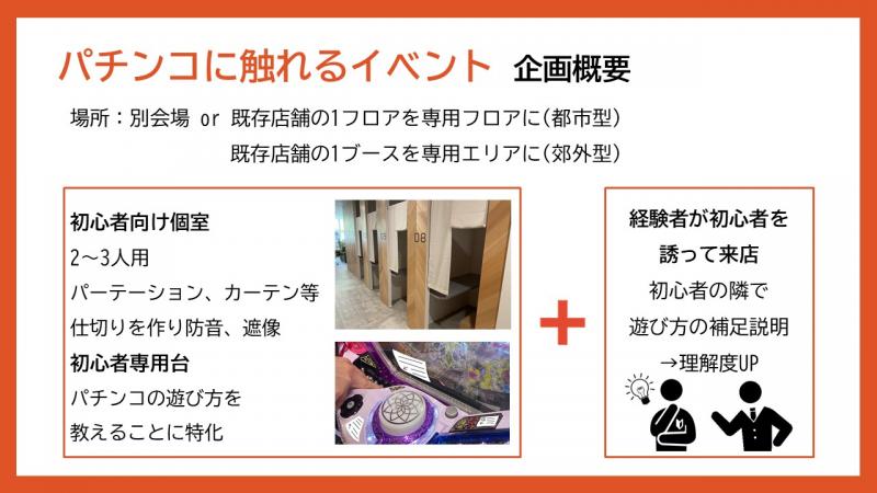 アンケートから分かった業界のネガティブイメージである「ギャンブル」「遊び方がわからない」「手軽に遊べなさそう」などを払拭するため、街中に無料でパチンコが体験できるボックスの設置を推奨。「一度でも体験してもらえれば、ゲームに馴染みのある若年層であれば、パチンコの遊技性を理解してくれると思った」と企画の趣旨を説明した。