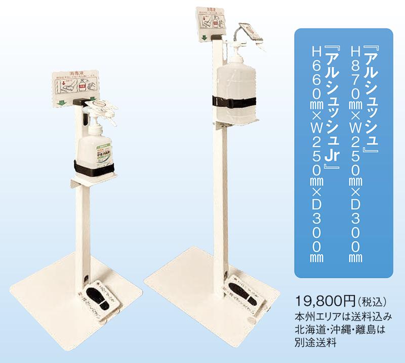 足踏み式アルコール消毒液スタンド『アルシュッシュ』と子供専用の『アルシュッシュJr』。不特定多数の人が直接ポンプに触れる手押し式のポンプと異なり、足で踏むだけで消毒液が噴霧され消毒できるので安心して使用することができる。