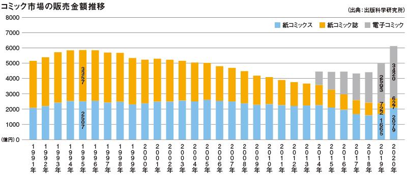 マンガの勢いが止まらない。2020年のコミック市場規模は、紙と電子を合わせて6126億円。前年比23.0%増と大躍進を遂げた。ピークだった1995年(5864億円)を優に超える快挙だ。95年は『週刊少年ジャンプ』が653万部発行された年。コロナ禍による巣ごもり需要がプラスに作用した。